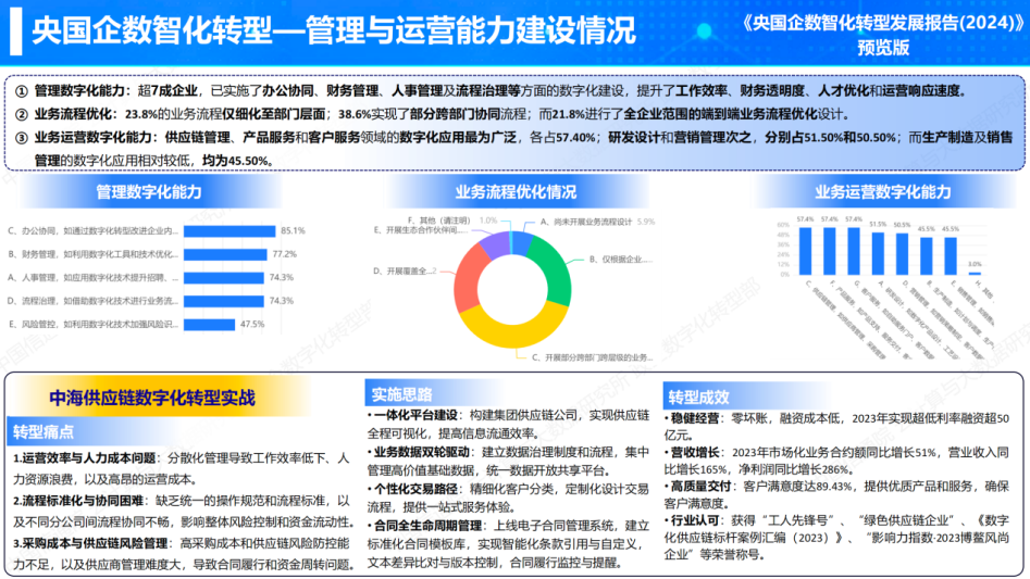 中海后天業務中的領潮供應鏈管理平臺,致力于為建筑企業提供一站式的建材產品,不斷探索數字化場景應用,促進建筑業與數字化融合。在助力數字化轉型過程中以出色的技術表現、夯實的解決方案能力,以及作為央國企企業在建設數字中國戰略的落實和推進過程中所承擔的使命和責任,被納入中國信通院《央國企數智化轉型發展報告(2024)》。